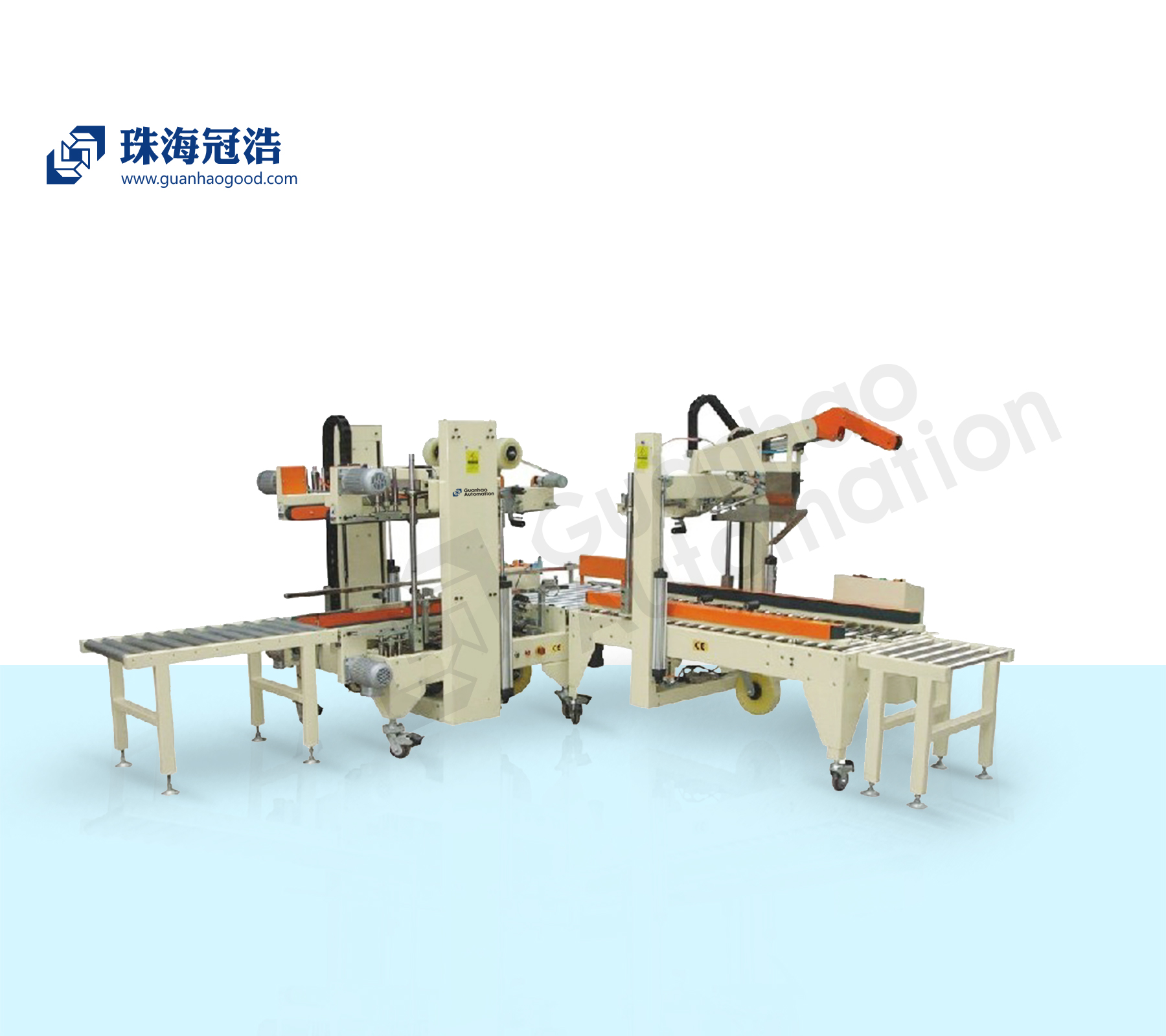 珠海冠浩機械-紙箱經(jīng)前段折蓋封箱機、一字型自動(dòng)封箱后,進(jìn)入90度轉角機,由推箱板推入角邊封箱機,
