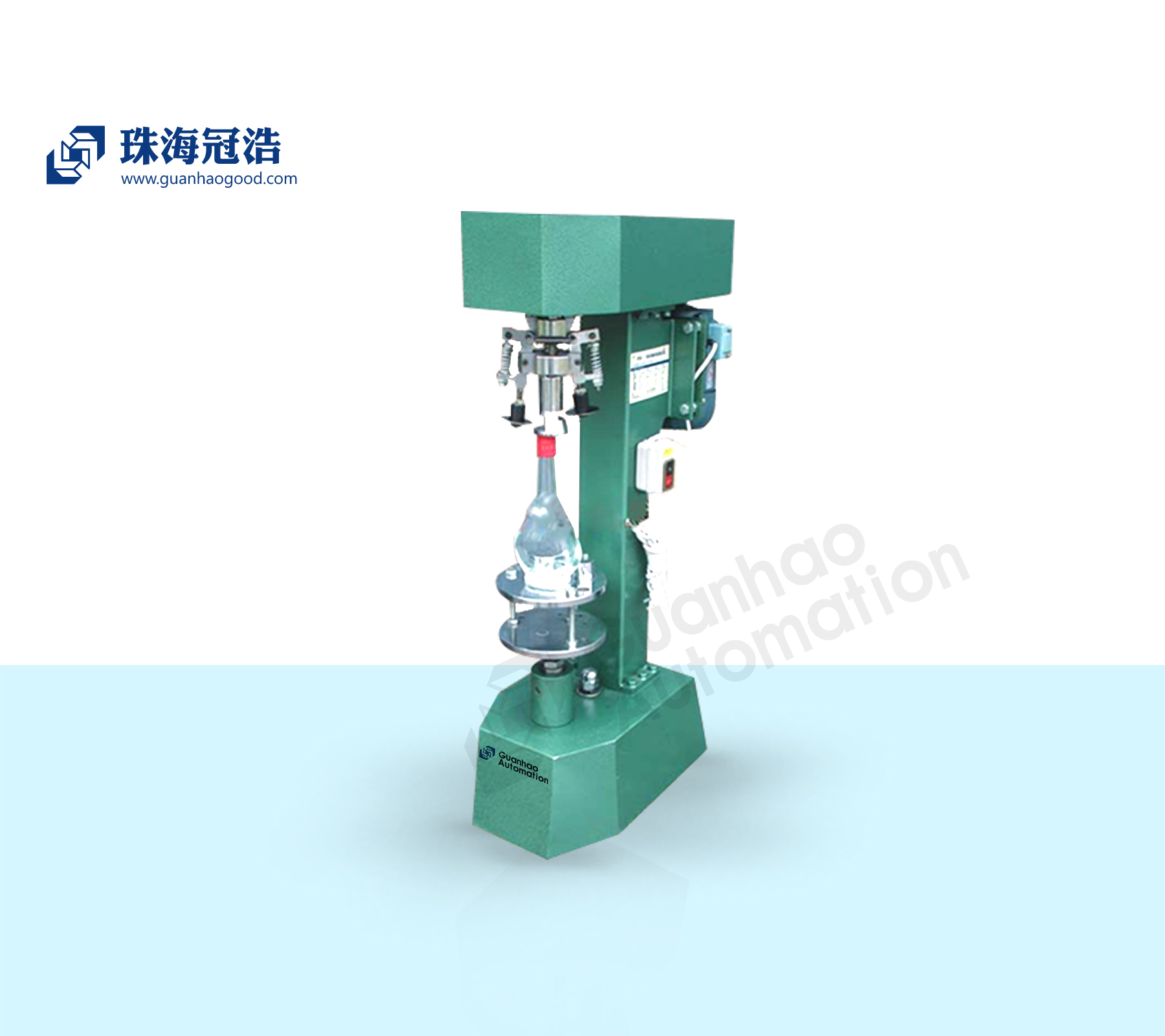 珠海冠浩機械-半自動(dòng)鎖蓋機采用兩刀封蓋、體積小,更換部分零件可進(jìn)行多種形式的封蓋。加裝玻璃護瓶罩,徹底解決了斜歪瓶的破損問(wèn)題,價(jià)格便宜。